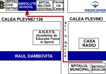CALEA PLEVNEI NR. 136, BUCURESTI (langa Spitalul Militar Central) TelefoaneRomTelecom - 021/31.41.444 Vodafone - 07 27 357 623 Orange - 07 44 47 17 86 Cosmote - 07 66 48 73 48 Fax: 031.816.79.74 E-mail: info@absoluteschool.net Mijloace de transport Metrou: